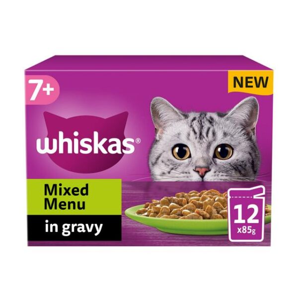 Whiskas 7+ Cat Pouches – Mixed Menu In Gravy (12x85g) are specially prepared to preserve the natural goodness and deliciousness of high quality ingredients and will see your cat rush to the bowl faster than ever before! Made with sustainably sourced ingredients, these cat food pouches contain everything your cat needs to keep them happy and healthy. 100% high quality ingredients. All of your 7+ cat’s daily needs.